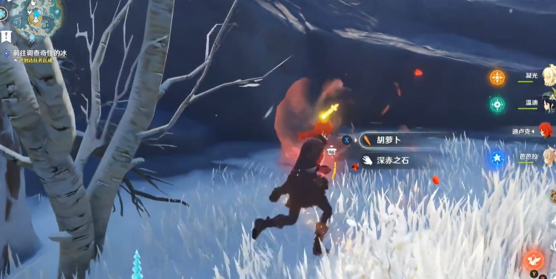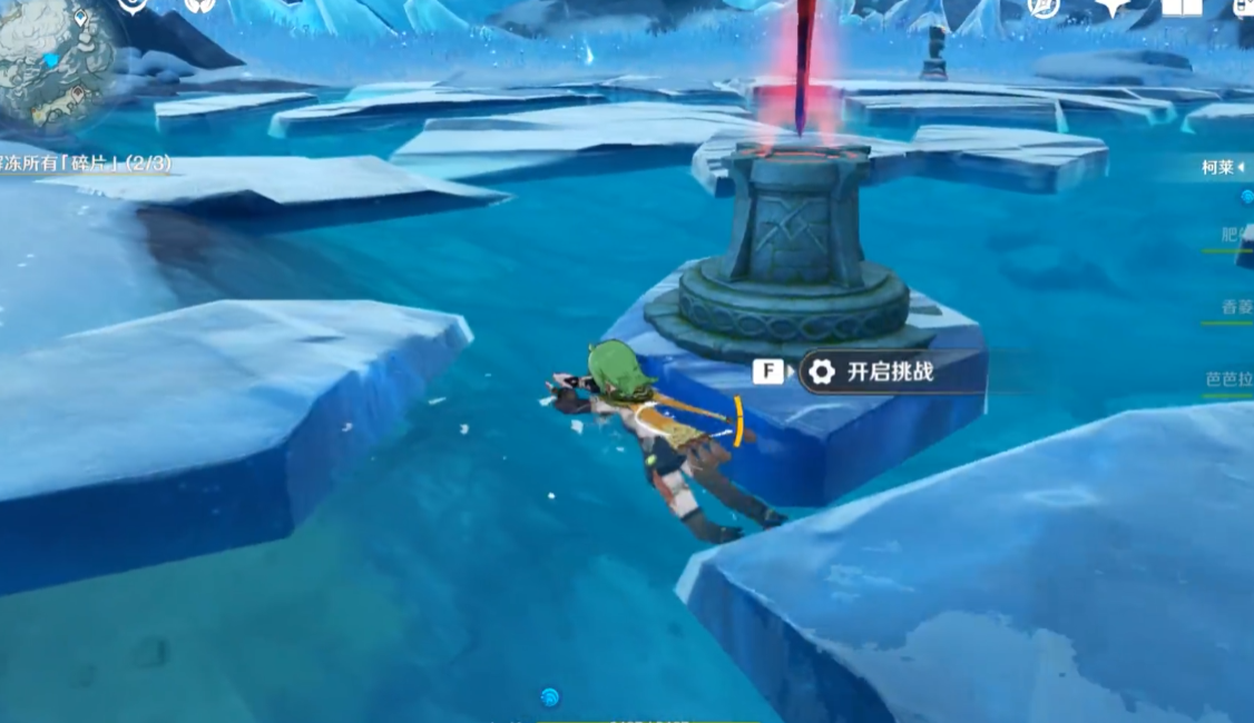 解除碎片屏障需要完成中央的限时挑战,该挑战会刷新四波怪物,最后一波有三只冰深渊法师,建议携带火元素角色应对。挑战完成后风圈消失,会出现一个珍贵宝箱。碎片周围分布着四个深赤之石,前面两个较为明显,后面两个需要绕到碎片背面寻找,其中一个藏在石头后面,击碎石头才能看到。