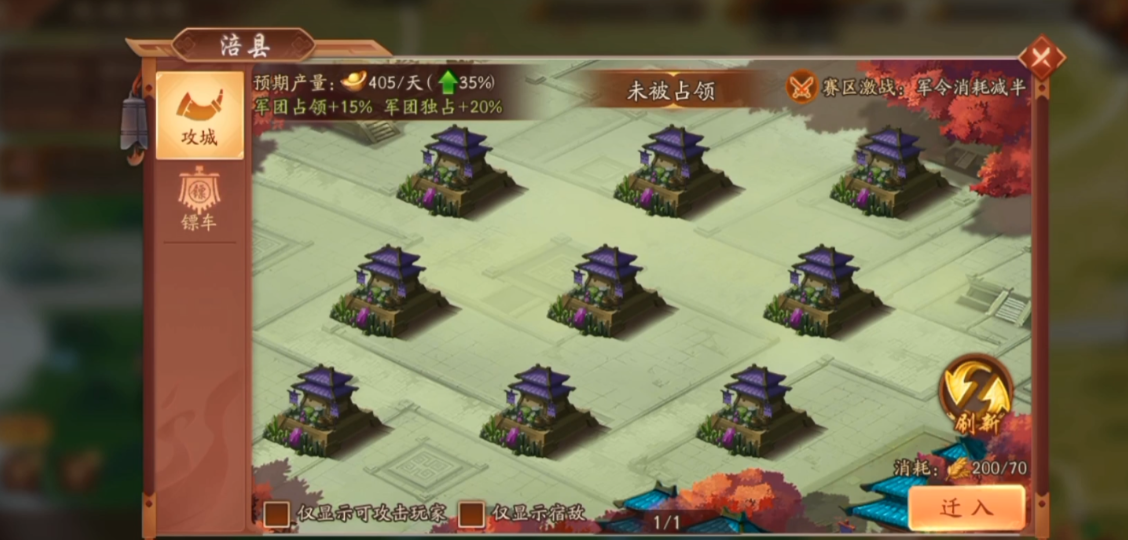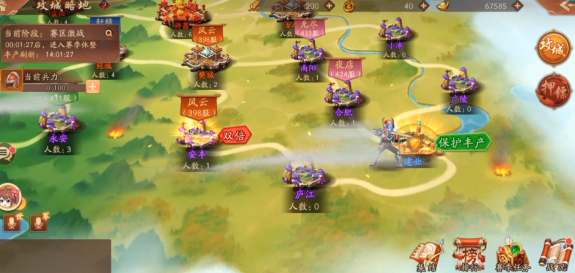 对于平民玩家来说,攻城的关键是抱大腿和捡漏。因为高战力大佬在攻城战中起决定性作用,所以咱们最好先观察军团里的大佬动向,等他们清理完敌方高战力玩家后,再跟进占领。贸然出手容易被反打,浪费粮食资源。如果军团整体实力一般,可以选择四个角的和平城池(成都、长安、邺城、建业),这些地方不会被攻打,每天中午12点会有一个城池刷新为丰产状态,虽然元宝少但胜在稳定。