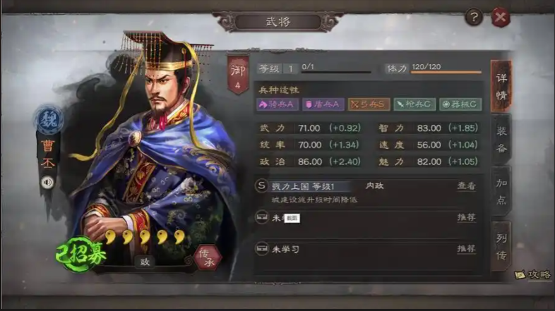 内政官的技能优先级高于基础属性,例如曹丕的建造时间缩短技能在前期开荒阶段价值极高,而陈群的冶铁技能可显著提升铁矿产量。技能与属性的叠加效果需高阶内政官如五星武将往往凭借技能优势碾压低星武将,但四星武将简雍、糜竺在技能加持下也能达到不错的效果。
