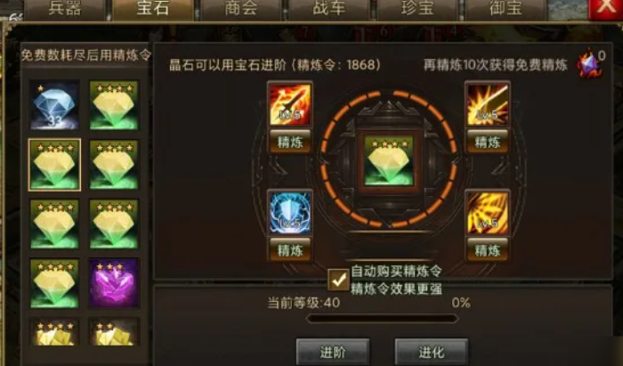 宝石系统是提升战斗力的重要途径,咱们可以通过打磨和精炼让宝石进阶为晶石甚至神石。首先需要将6个晶石都升级到21级,并且在升级过程中参与精炼活动,这样才能激活技能。晶石技能有七种,包括斩杀、暴击、韧性、无双、强袭、坚守和乱舞,每种技能都能大幅提升武将的战斗力。进阶到晶石后,还能继续升级为神石,开启更强大的屠城功能。