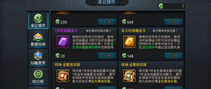 想送时装,关键道具叫做时装赠送卡。这卡片分好几种时效,有3天、7天、30天和永久的,送出去的衣服能穿多久就看用的什么卡了。这些卡不是白来的,主要得去两个地方换:善缘珍阁和凌云锦市。在善缘珍阁里换,通常需要消耗元宝,并且你的善缘值得到一定要求,比如100点;而去凌云锦市换,一般需要消耗充值获得的凌云壁。不同卡还有兑换限制,像3天卡可能每周限兑2次,7天卡有总次数上限,永久卡则比较稀有。送时装其实需要你先投入一些游戏资源去换到这张通行证。