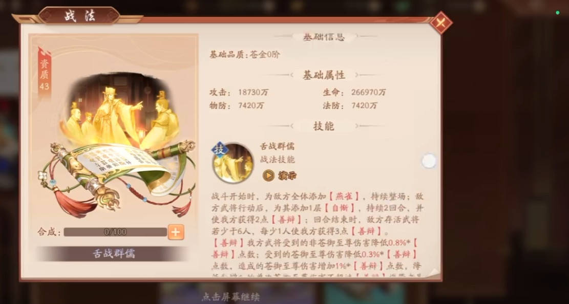 战法系统不像锦囊可以随便换来换去,一个战法只能给一个武将用,而且激活和升级都需要消耗武将资源,一旦装上再换掉可能会有损失,所以选择时要谨慎。对于孙鲁班这样多面手的武将,可以优先考虑那些效果全面或者能和她技能形成联动的战法。升级战法能显著提升效果,这需要消耗对应的碎片或资源。部分金色战法的碎片可以在日常商店里稳定获取,建议有规划地积攒,尽早兑换并升级。也要注意孙鲁班自身装备、宝物等其他养成部分的均衡发展,比如宝物精炼的等级、装备的强化和升星,这些基础属性的提升能让战法的效果发挥得更好。