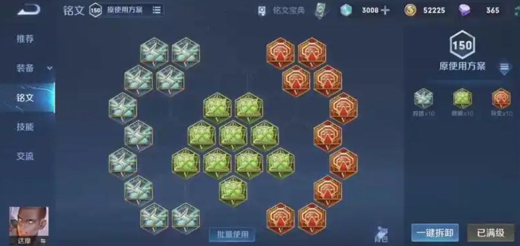 铭文搭配也很关键这直接影响到你前期的战斗力。最通用也最推荐的一套是百穿铭文,也就是红色异变、绿色鹰眼、蓝色隐匿。这套铭文提供了大量的物理穿透和攻击力,配合达摩二技能自带的破甲效果,在前中期打人非常痛,几乎像真实伤害一样。隐匿提供的移速也能让你支援和逃跑更灵活。如果你觉得身板有点脆,也可以把蓝色铭文换成几个调和,增加一点血量和回复,但伤害会稍微低一些。铭文和出装才能让达摩在线上或野区打得更有压制力。