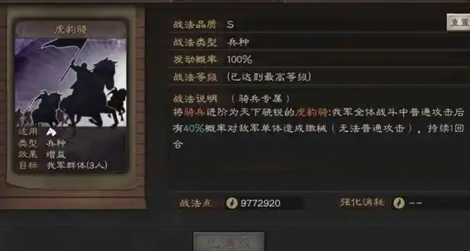 组建虎豹骑阵容首先要从核心战法虎豹骑本身说起。这个战法需要通过传承武将曹纯来获得,它是骑兵的专属战法,也就是说你的队伍必须全部是骑兵才能使用它。装备了这个战法后,能在战斗中提升我方全体的武力,最关键的是在前三个回合能显著提高全队突击战法的发动概率。如果你让曹纯本人来携带这个战法,那发动概率的提升效果还会额外受到武力值的影响,变得更高。它的核心思路就是利用前三回合的高爆发,通过突击战法快速压低甚至直接击败对手,属于追求速战速决的菜刀流派。
