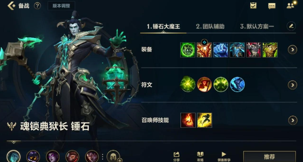 符文搭配上主系通常选择坚决系的余震,在定身敌人后获得防御加成和额外伤害,弱点能对减速目标提升伤害,忠诚提供共享防御,集群猎手则增加移速和金币收益,副系可选启迪系的完美时机和星界洞悉,减少技能冷却和装备激活时间,这套符文能强化锤石的控制链和生存,让他在对线和团战中发挥稳定。技能加点推荐主E副Q,有R点R,因为E技能的被动普攻伤害随灵魂数提升,能增强对线消耗,Q技能作为主要控制手段,命中后可以减少冷却,便于连续使用,W技能提供护盾和位移,是保护队友的关键,在对线时锤石应利用手长优势进行骚扰,并配合灯笼为打野或ADC创造击杀机会,团战中可以优先控制后排或保护己方输出。
