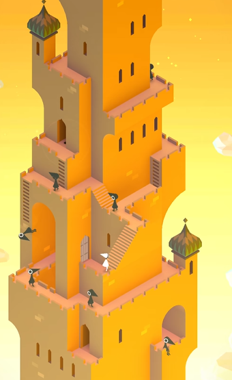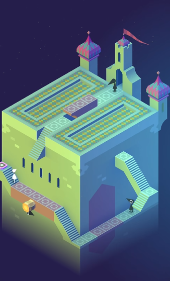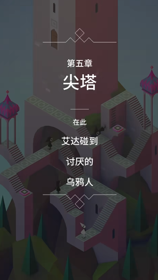第四关水宫要求玩家运用旋转把手和转盘机制,先旋转把手使楼梯相连并走到道路尽头,然后旋转圆点连通道路并点击橙黄色按键。旋转转盘进入小门完成对话剧情后,旋转角色脚下的道路,向右滑出楼梯移动到橙黄色按键处,按住转盘旋转整个迷宫拼接道路走到第二层。利用爬梯走向最高层到达顶层橙黄色按键处,旋转道路走到乌鸦附近的粉红色道路上,旋转乌鸦所在的转盘进入小门,与蓝色小人对话后旋转中间的道路走向终点。第五关尖塔的攻略重点在于避开乌鸦人和使用旋转结构,玩家需利用岔口和小亭子避开乌鸦人来到玫红色按钮处,然后旋转墙壁上的把手到达上层的玫红色按钮处。爬上爬梯进入小门来到新场景,旋转按钮避开乌鸦人踩到玫红色按钮上,继续旋转把手将道路中的乌鸦清除后走入小门进入新场景。