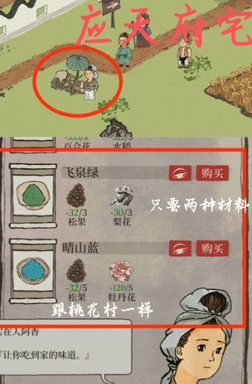 兑换晴山蓝需要准备5个松果和5朵牡丹花作为材料。松果可以从松树上采集,例如在丽娘府邸的园子里就有松树分布,玩家消耗体力点击即可获得。牡丹花生长在粉红色的花丛中,颜色鲜艳,在游戏的各个副本中都能找到,玩家同样消耗体力从绿色草丛中采摘,收集过程简单直接。
