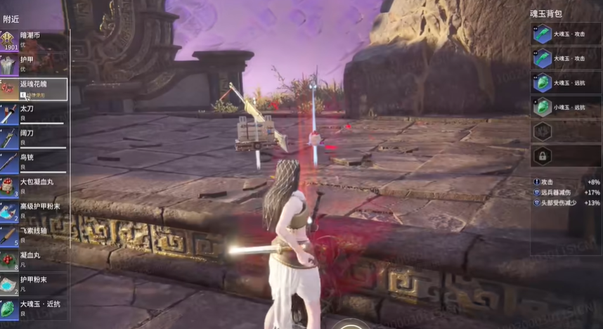 快速吃掉返魂花关键是掌握好按键的时机和顺序。很多朋友可能习惯打开背包再去点使用,那样就太慢了,在紧张的战斗中根本来不及。正确的方法是,当你击败敌人后,视角一定要对准那个发着红光的魂花,然后快速连续按下两次E键。这个操作不需要你打开任何界面,系统会自动帮你完成拾取和使用的动作,角色会有一个快速弯腰的动作,花就被吃掉了,你的体力、护甲和怒气都能得到回复。这个操作只对返魂花有效,对地上的其他武器或者魂玉是不起作用的,所以一定要看准目标。