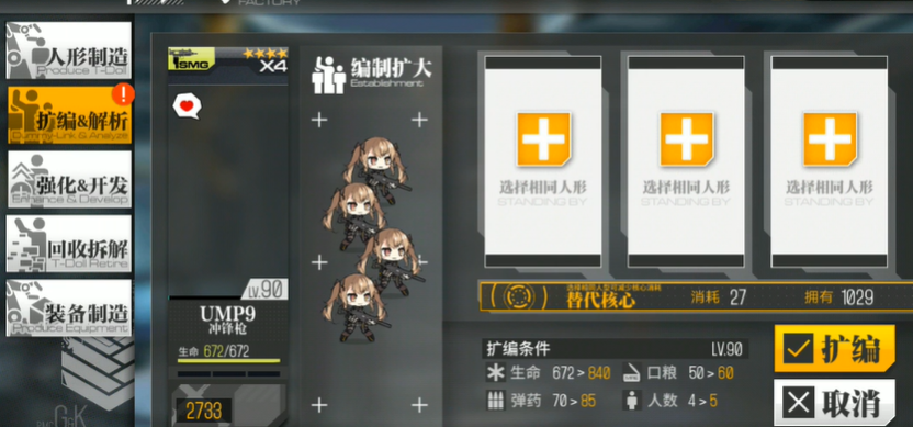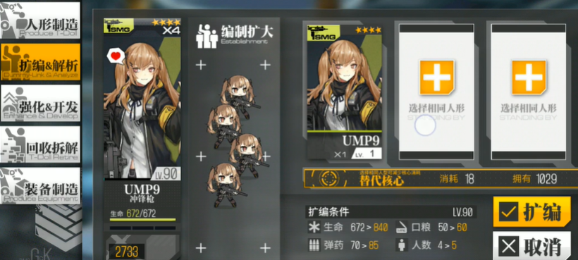 枪娘在等级达到10级、30级、70级和90级时分别有机会进行扩编,每次扩编都会让该枪娘在梯队中的数量增加一位,这需要通过消耗同名战术人形或替代核心来实现,替代核心是一种稀有资源,只能通过拆解三星以上枪娘或完成每周任务获取,且高星级枪娘扩编时所需的核心数量会更多。