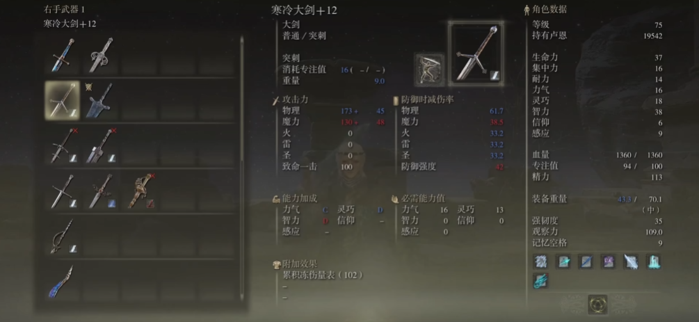 武器强化与装备选择需服务于敏捷流派的战斗逻辑,初期以强化弯刀为主,中后期可转向出血属性武器以应对高抗性敌人。双持弯刀的快速连击是剑士的核心输出手段,需优先消耗锻造石强化主力武器,提升基础攻击力。后期可更换寒冷大剑等附带出血效果的武器,利用高频攻击触发百分比扣血的异常状态,弥补对高韧性敌人的输出短板。防具需兼顾防御性能与重量平衡,选择中等负重的护甲将总负重维持在中等区间,以保证翻滚效率与体力恢复速度。小圆盾的弹反战技是高风险高回报的反制手段,但操作门槛较高,若不擅长可替换为防御强度更高的中型盾牌。