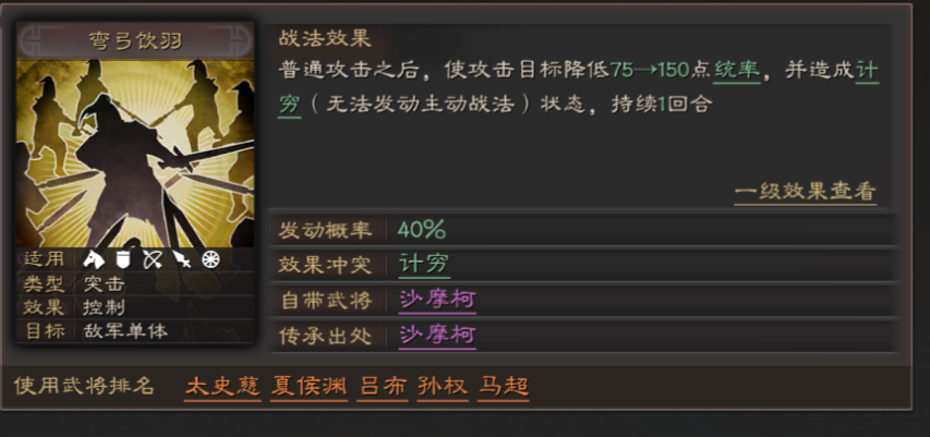 此次更新对孙策的核心战法与属性进行了关键优化,自带战法江东小霸王由普攻后触发改为每回合独立触发,发动概率从35%提升至50%且受武力影响,实战中稳定在56%左右,不再惧怕缴械、震慑等控制,输出节奏更顺滑。伤害率直接翻倍至192%,主将效果前两回合可使敌军单体增伤30%,同时治疗机制改为定向奶兵力最低武将,治疗率最高56%,兼顾输出与续航,武力成长也从2.07提升至2.2,面板更扎实。