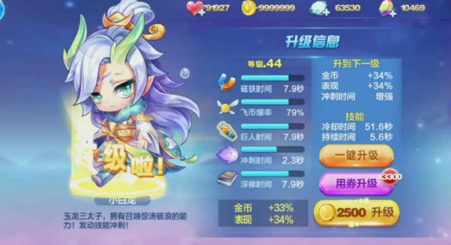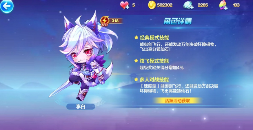 李白拥有三段跳和滑翔能力,机动性更强,跑酷时能轻松避开复杂障碍。他的御剑飞行技能可以召唤万剑诀破坏前方障碍,同时掉落高分狐仙石飞币,但要注意每次释放会消耗灵力影响冲刺时间。小白龙则是四段跳高手,虽然少了滑翔但跳跃优势明显,技能召唤的惊涛骇浪能横扫障碍物,配合定情信物贝壳还能触发额外加分效果。