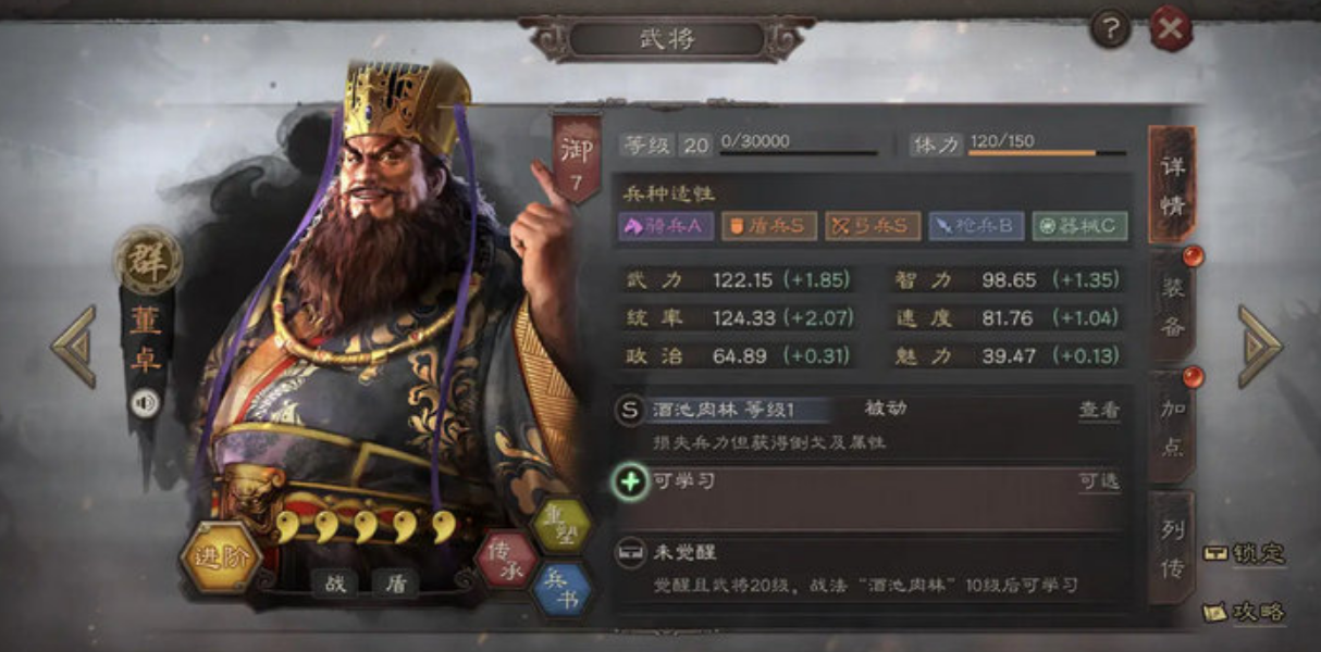 兵种适性上,董卓拥有骑兵、盾兵双S级和弓兵A级,主流阵容多选择盾兵或骑兵。盾兵路线常搭配藤甲兵、锋矢阵等减伤战法,利用高统率成长扛伤;骑兵路线则侧重输出,配合突击类战法补充伤害。其属性成长均衡,武力与统率突出,智力中等,适合承担前排抗压任务。董卓作为7御武将,组队时需合理分配统御值,优先搭配低御辅助或高输出副将,如华佗、吕布等,以优化阵容强度。