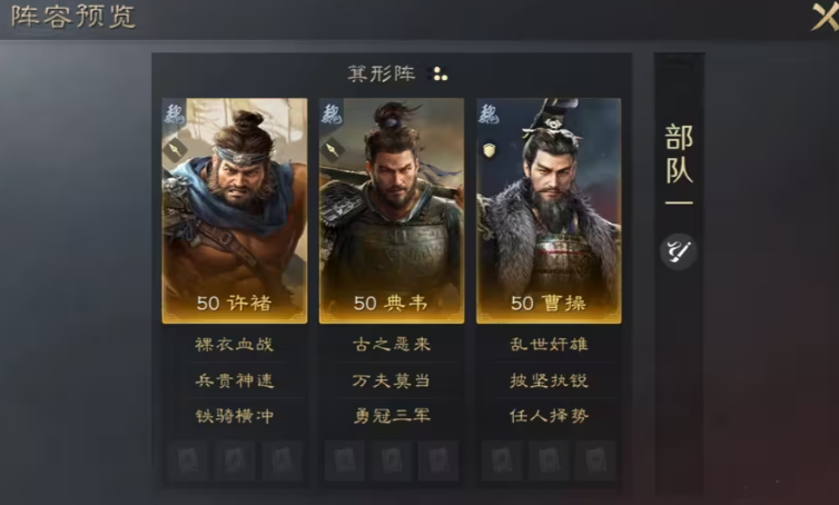 许褚的兵种适应性也很不错,盾兵和枪兵都是S级,骑兵也有A级,这让他在阵容搭配上非常灵活。以前大家总觉得他容易被控制或者遇到高智力队伍就吃瘪,但现在配合锋矢阵或者曹操的增伤,他的输出环境改善了很多。尤其是搭配典韦和曹操的虎卫缘分组合,不仅能减伤,还能让许褚的输出更稳定。如果再加上满宠或者夏侯惇这样的辅助,整个队伍的生存能力也会大幅提升,让许褚有机会在后期打出更高的伤害。