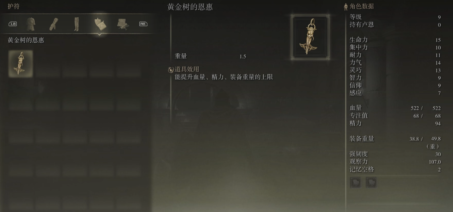 黄金种子的优势在于它能立即增加一次圣杯瓶的使用次数,无论是血瓶还是蓝瓶,都能在战斗中获得更多容错空间。尤其在面对早期BOSS或探索高难度区域时,额外的恢复机会往往能扭转战局。虽然游戏中后期可以通过探索获得更多黄金种子,但开局携带一个能显著降低前期难度。石剑钥匙则用于解除小恶魔雕像的封印,开启隐藏区域或获取特殊道具。出生点附近的雾门内就藏有黄金树的恩惠护符,对角色属性有全面增益。