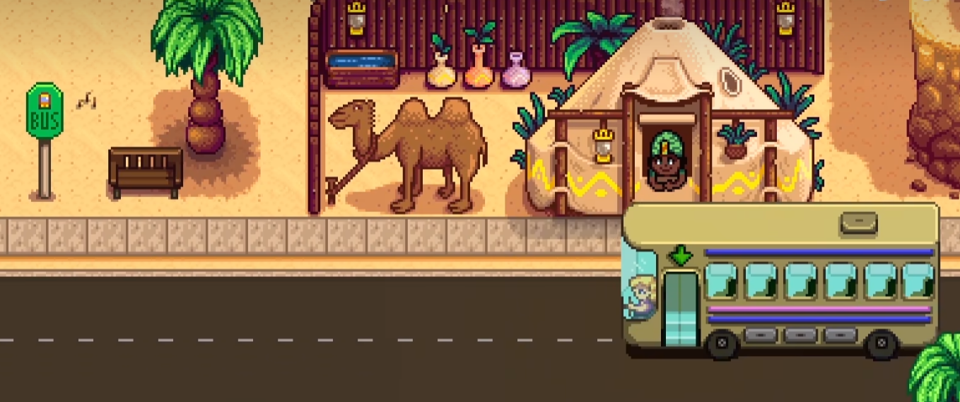 完成献祭还会解锁前往沙漠的巴士服务,只要花500金币就能去沙漠探险。沙漠里有独特的商店、矿洞和可采集物品,比如仙人掌果实和椰子。沙漠矿洞比普通矿洞更有挑战性,但奖励也更丰厚,是后期获取稀有材料的好地方。