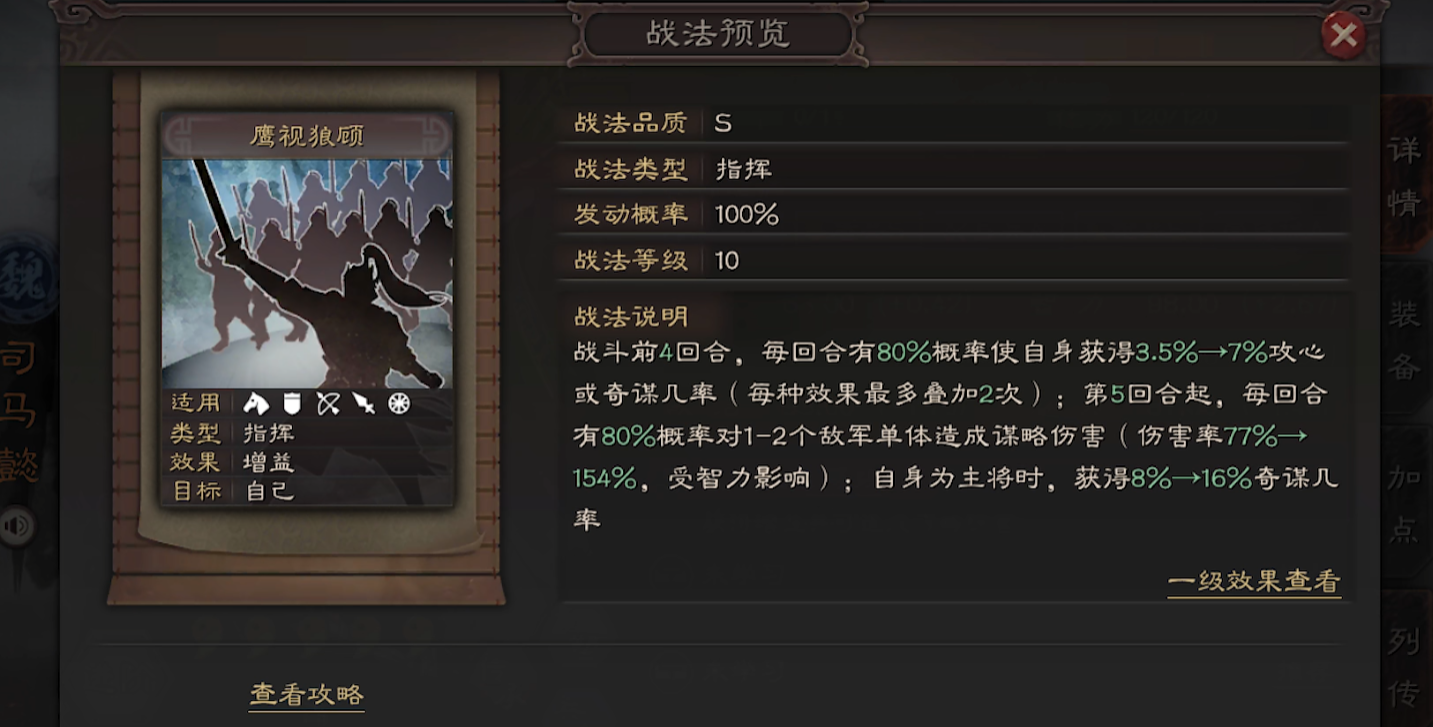 阵容搭配上,司马懿属于慢热型武将,前期需要队友保护,后期才能爆发。常见的搭配是司马盾阵容,比如和曹操、华佗组队,曹操提供减伤和辅助,华佗负责治疗,司马懿专注输出。如果没有曹操,也可以用郝昭或者满宠替代,效果也不错。战法方面优先选指挥型或被动型,比如藤甲兵刮骨疗毒,确保生存能力拖到后期。