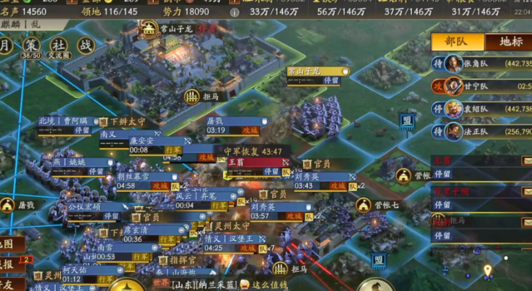 合兵攻打是同盟作战的核心策略之一,需要精确的兵力调配和战术协同。合兵的关键在于协调多支部队同时进攻同一目标,通过兵力优势快速击溃敌方防御。首先需要明确目标城池或领地的守军情况,侦查敌方兵力部署和兵种构成,根据情报调整己方部队的兵种克制关系。主力部队应优先选择高统率、高防御的武将带队,确保第一波进攻能有效消耗敌方兵力。