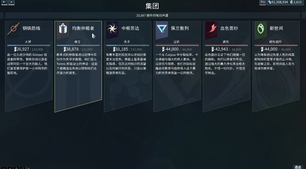 佩戴集团纹章是获取声望的基础方式。在军械库的战甲外观选项中,选择特殊饰品栏位装备均衡仲裁者纹章(正面或背面均可)。佩戴后完成任意任务均可积累声望值,每日有上限限制。初始需积累5000声望以解锁每日声望任务,后续可通过集团商店购买高级纹章提升效率。注意同一时间仅能佩戴一个集团纹章,且选择对立集团会导致声望衰减。