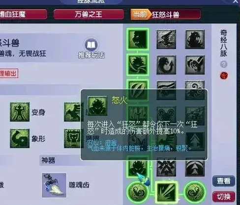 狂怒斗兽流派因狂怒状态强化成为当前版本亮点,推荐3211232点法。第一层击飞召唤兽触发狂怒的机制优化后,配合第三层暴怒的必杀效果可显著提升爆发,第四层九天或协战需根据团队需求选择,前者专注鹰击增伤,后者覆盖全技能收益。第五层狂袭应对反震怪效果显著,第六层怒火或乱击则取决于战斗节奏,前者适合持久战叠加伤害,后者优化单体点杀效率。