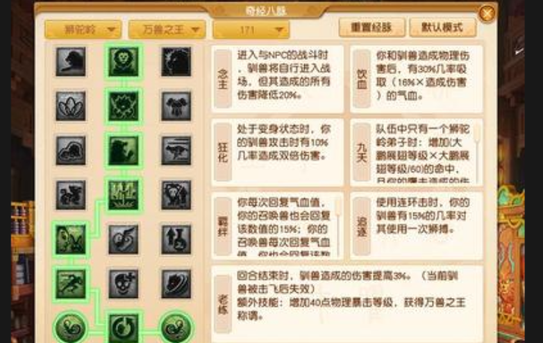 2025年狮驼岭经脉调整后,核心流派仍围绕嗜血狂魔、万兽之王与狂怒斗兽展开,不同场景需针对性选择点法。纯挂机玩家推荐嗜血狂魔1121212点法,第二层吸血配合九天增伤可稳定输出,第六层乱击作为单点备选方案,兼顾生存与伤害。若队伍治疗充足,第二层可替换为宁息提升续航,第四层协战则适配多目标战斗,其全伤害加成在奇袭触发后仍生效,泛用性更强。