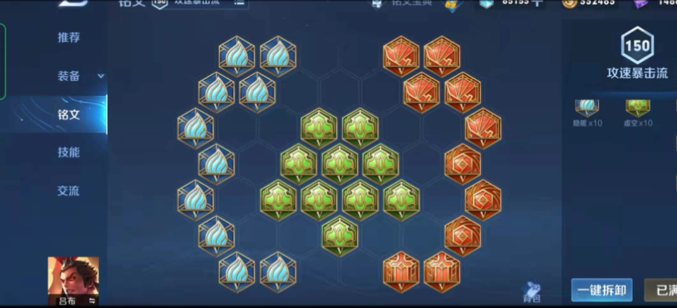 最后简单提下铭文搭配这对前期对线也有不小帮助。红色铭文通常带红月或者传承,一个加攻速和暴击,一个直接加攻击力。绿色铭文常用虚空,增加生命和冷却缩减。蓝色铭文可以选择隐匿或者狩猎,增加移速和攻击力或者攻速。带点攻速会让吕布的普攻手感更顺滑,穿插在技能之间输出更流畅;而带纯攻击力和穿透的铭文则追求技能那一下的更高伤害。