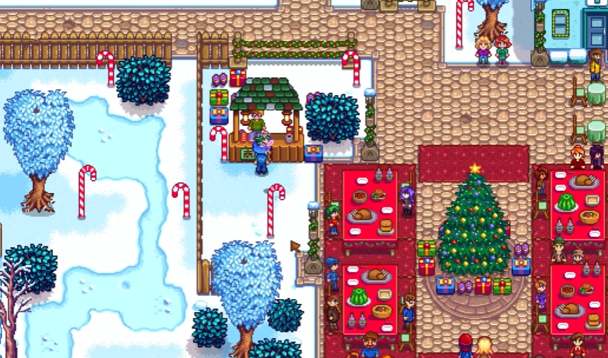 冰雪节在冬季第8天举行,主要活动是冰钓比赛,捕获至少5条鱼可获得珍贵钓具。冬日星盛宴在冬季第25天举办,玩家需要根据系统随机分配的神秘好友信息准备礼物,同时也会收到村民回赠的礼物。此外还有冬日谜团任务,跟随脚印在灌木丛中找到暗影人科罗布斯可获得放大镜,解锁秘密纸条系统。