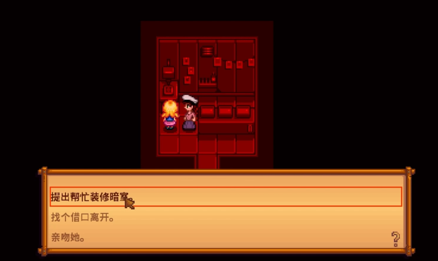 选择帮助装修暗室需要消耗一定数量的木材和石头材料,并需邀请罗宾协助完成工程。这个选项会直接提升海莉对玩家的好感度约三星,同时扩大暗室空间并改善环境美观度。该选择适合处于关系发展中期、需要快速积累好感度的玩家,虽然需要付出资源成本,但能稳定推进感情线且不会引发负面事件。装修完成后暗室的功能性也会得到提升,为后续互动创造更好条件。